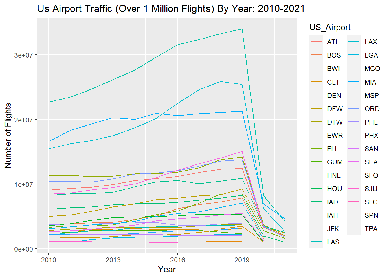 labs(title = "Us Airport Traffic (Over 1 Million Flights) By Year: 2010-2021") +
